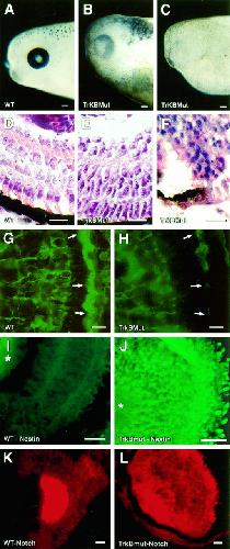 Retinal pigment abnormalities in dominant negative TrkB mutants. Representative photographs of the eyes of water-injected controls (A) and the trkB dominant negative mutants (B, C). D–F, Representative sections from the central retinas of cresyl violet–eosin-stained tissues. Embryos were generated simultaneously and killed at stage 45. A water-injected embryo is shown in D; mildly and severely affected embryos are seen in E and F, respectively. Scale bar, 50 μm. G, H, Immunofluorescent sections from a stage 45 water-injected control embryo (G) or mildly affected mutant (H) probed with a polyclonal antibody to CRALBP (Bunt-Milam and Saari, 1983). Arrows indicate the RPE layer. I,J, Immunofluorescent sections from stage 45 water-injected controls (I) or a severely affected mutant (J). Sections were probed with a polyclonal antibody raised against the intermediate filament nestin (Tohyama et al., 1992). K, L, Sections from a stage 45 water-injected control (K) or severely affected trkB mutant (L) probed with RITC antisense riboprobe for Xenopus Notch. Scale bar, 0.1 mm.