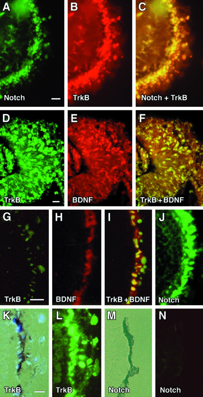 Co-Localization of Notch, TrkB, and BDNF in the developing optic cup. Top panels, FISH of stage 26 Xenopus optic cups (sagittal sections, en face). In A–C, a single section was probed with cRNA antisense probes incorporating fluorescein-12-UTP (Boeringer Mannheim) for Xenopus Notch (A) or TMR-5-UTP (Molecular Probes) fluorescein isothiocianate for the kinase-containing domain of Xenopus trkB (B) andNotch plus trkB (C). D–F, FISH of stage 28 retinas (coronal sections) probed with FITC antisense riboprobes for trkB (D), RITC probes for BDNF (E), and FITC-trkB plus RITC-BDNF (F). G–J, en face views of stage 30 Xenopus retinas probed with FITC-trkB (G), RITC-BDNF (H), FITC-trkB plus RITC-BDNF (I), and FITCNotch (J). K, Bright-field exposure of a stage 32 Xenopus retina probed with FITC-trkB (L). M, Bright-field exposure of a stage 32 Xenopus retina probed with FITC-Notch (N). Scale bar, 0.1 mm.