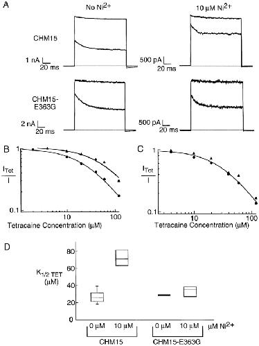Figure 8. The E363G mutation in CHM15 eliminated Ni2+ relief of tetracaine block. (A) Block of CHM15 and CHM15-E363G channels in the absence and presence of Ni2+. Currents are in response to a voltage step to +60 mV from a holding potential of 0 mV for four separate patches. In each panel, the top trace shows current in the absence of tetracaine and the bottom trace shows current in the presence of 40 μM tetracaine. The shaded line represents the zero current level. (B) Dose–response curves for tetracaine from two separate patches containing CHM15 channels in the presence of 0 (•) or 10 (▴) μM Ni2+. All currents were measured at +60 mV. All currents were recorded in the presence of saturating (2 mM) cGMP and normalized by currents recorded in the absence of tetracaine. Fits are to Eq. 2. For 0 μM Ni2+: K1/2Tet = 26.5 μM, n = 1.0; for 10 μM Ni2+: K1/2Tet = 59.4 μM, n = 1.0. (C) Dose–response curves for tetracaine for two separate patches recorded from CHM15-E363G channels in the presence of 0 (•) or 10 (▴) μM Ni2+. The fit is to Eq. 2 with K1/2Tet = 31.0 μM, n = 1.3. (D) Box plot showing range of tetracaine-apparent affinities for CHM15 and CHM15-E363G channels in 0 and 10 μM Ni2+. The line in the middle of the boxes shows the median. The top and bottom edges of the boxes show the 25th and 75th percentiles of the data. The whiskers coming out of some of the boxes show the 5th and 95th percentiles.