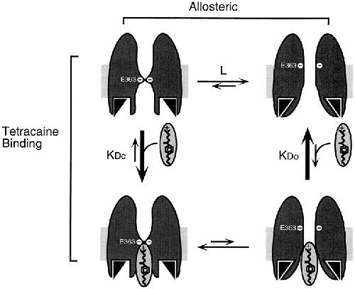 Local anesthetics are a diverse group of clinically useful compounds that act as pore blockers of both voltage- and cyclic nucleotide-gated (CNG) ion channels. We used the local anesthetic tetracaine to probe the nature of the conformational change that occurs in the pore of CNG channels during the opening allosteric transition. When applied to the intracellular side of wild-type rod CNG channels expressed in Xenopus oocytes from the alpha subunit, the local anesthetic tetracaine exhibits state-dependent block, binding with much higher affinity to closed states than to open states. Here we show that neutralization of a glutamic acid in the conserved P region (E363G) eliminated this state dependence of tetracaine block. Tetracaine blocked E363G channels with the same effectiveness at high concentrations of cGMP, when the channel spent more time open, and at low concentrations of cGMP, when the channel spent more time closed. In addition, Ni2+, which promotes the opening allosteric transition, decreased the effectiveness of tetracaine block of wild-type but not E363G channels. Similar results were obtained in a chimeric CNG channel that exhibits a more favorable opening allosteric transition. These results suggest that E363 is accessible to internal tetracaine in the closed but not the open configuration of the pore and that the conformational change that accompanies channel opening includes a change in the conformation or accessibility of E363.