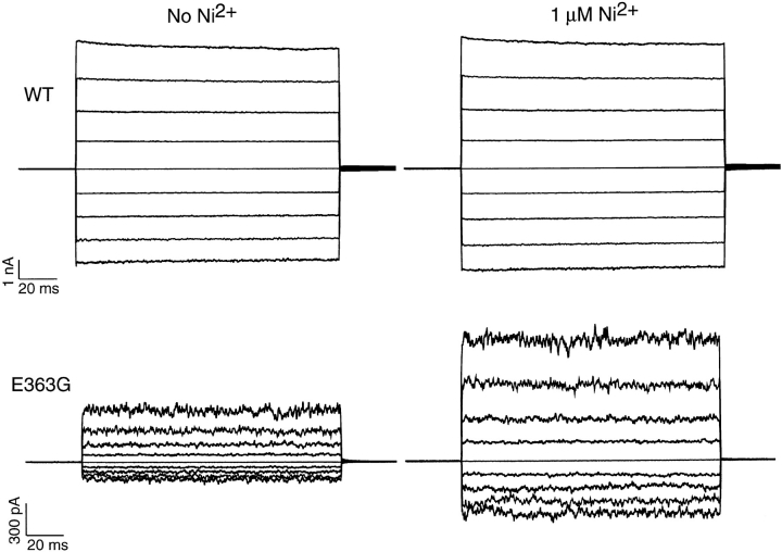 Figure 3. Ni2+ substantially increases the currents produced by saturating (4 mM) cGMP in E363G but not in wild-type channels. Currents are in response to families of voltage steps from a holding potential of 0 to between −80 and +80 mV in increments of +20 mV. Leak currents in the absence of cGMP have been subtracted.