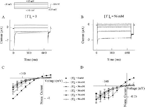 Figure 1. Effect of extracellular I− on hClC-1 expressed in Xenopus oocytes. (A) Current responses to voltage steps from a holding potential of −30 mV in 40-mV steps from −145 to +15 mV measured in standard extracellular solution. Each test pulse is followed by a step to −125 mV. (B) Current responses to the same pulse protocol in the same oocyte as in A after substitution of 96 mM NaCl by an equimolar concentration of NaI. (C) Voltage dependence of the instantaneous current amplitude for different extracellular [I−]. Data represent mean ± SEM from four different cells (every cell was tested with each [I−]). Current amplitudes were normalized to the instantaneous current amplitude measured at −145 mV in the absence of extracellular I−. (D) Voltage dependence of the late current amplitude obtained from the same data set shown in C. Data were normalized in the same way as in C. |