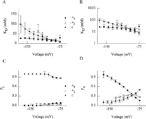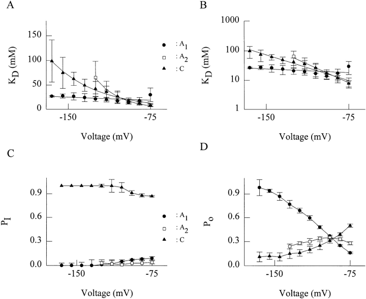 Figure 6. Voltage dependence of I− binding in hClC-1. Voltage dependence of the apparent dissociation constants (KD) for the three different kinetic states shown as linear (A) and semi-log (B) plots. Lines indicate fits of the Woodhull formula: KD = KD(0 mV) e−FδV/RT, where KD(0 mV) denotes the estimated value at a membrane potential of 0 mV, and δ is the electrical distance measured from the extracellular side of the membrane. (C) Voltage dependence of the limiting values for the derived fractional current amplitudes at very high extracellular I− concentration (pI). (D) Voltage dependence of the limiting values for the derived fractional current amplitudes at zero extracellular [I−] (po). |