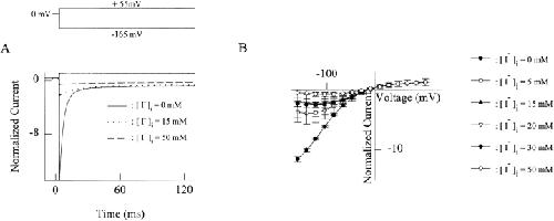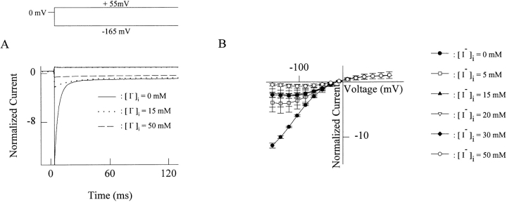 Figure 8. Effect of intracellular I− on hClC-1 current in HEK-293 cells. (A) Current responses to voltage steps to −165 and +55 mV from a holding potential of 0 mV. Data shown are from three different cells exposed to three different internal I− concentrations as indicated in the figure. Currents were normalized to the current amplitude measured at +55 mV. (B) Voltage dependence of the instantaneous current amplitude for different intracellular I− concentrations. Iodide concentration was changed by replacing different amounts of Na-gluconate with NaI in a pipette solution containing (mM): 50 NaCl, 80 Na-gluconate, 2 MgCl2, 5 EGTA, 10 HEPES, pH 7.4. Each point represents mean ± SEM from four cells. Current amplitudes were normalized to the value measured at +75 mV. |