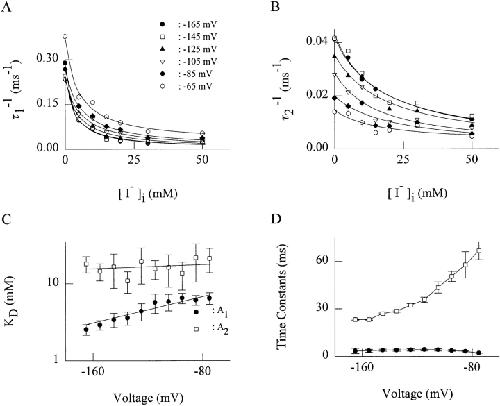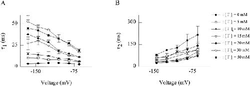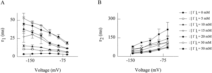 Figure 10. Effect of intracellular I− on deactivation time constants. (A) Voltage dependence of the fast deactivation time constants (τ1) for different intracellular I− concentrations. Each point represents mean ± SEM from four cells. (B) Voltage dependence of the slow deactivation time constants (τ2) for different intracellular I− concentrations. |