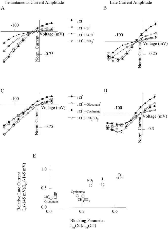 Figure 3. Normalized current–voltage relationships for hClC-1 in various extracellular solutions. For each anion tested, 48 mM NaCl was replaced by equimolar NaX, with X denoting different anions. For each anion, instantaneous (A and C) and steady state (B and D) currents were measured during voltage steps from a holding potential of −30 mV and normalized to the instantaneous current amplitude at −145 mV for the same oocyte in ND-96. Each point represents mean ± SEM for at least three cells. (A) Voltage dependence of the instantaneous current amplitude for extracellular solutions containing 96 mM NaCl (•), 48 mM NaCl + 48 mM NaBr (□), 48 mM NaCl + 48 mM NaSCN (▴), and 48 mM NaCl + 48 mM NaNO3 (▿). (B) Voltage dependence of the steady state amplitudes from the same recordings as shown in A. (C) Voltage dependence of the instantaneous current amplitude for extracellular solutions containing 96 mM NaCl (♦), 48 mM NaCl + 48 mM Na-gluconate (○), 48 mM NaCl + 48 mM Na-cyclamate (•), and 48 mM NaCl + 48 mM NaCH3SO3 (□). (D) Corresponding steady state values from the experiment shown in C. (E) Correlation between a blocking parameter (Ipeak in the presence of 48 mM anion divided by Ipeak in the presence of Cl− measured at −145 mV) and relative late current (Ilate divided by Ipeak measured at −145 mV) for various extracellular anions. |