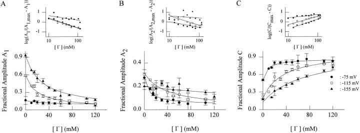 Figure 5. Relationship between extracellular I− concentration and fractional current amplitudes. Fractional current amplitudes were determined at three different test potentials (−75, −115, and −165 mV) as described in methods. Solid lines represent fitted hyperbola (see text) to the measured data. Each point represents mean ± SEM for at least three cells. (A) Fast deactivating fractional current amplitude, A1. (B) Slow deactivating fractional current amplitude, A2. (C) Nondeactivating fractional current amplitude, C. Insets show transformations of the data with fitted regression lines as described in results. Hill coefficients determined from the regression lines are as follows: A1: 0.47, 0.96, and 1.00; A2: 0.59, 0.98, and 0.22; C: 0.31, 0.86, and 0.99 for test potentials of −75, −115, and −155 mV, respectively. |