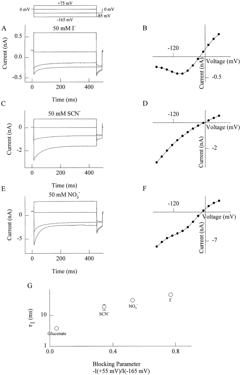 Figure 9. Effect of different intracellular anions on hClC-1 stably expressed in HEK-293 cells. (A, C, and E) Current responses to voltage steps from a holding potential of 0 mV to test potentials between −165 and +75 mV in 80-mV steps. Each step is followed by a test potential of −85 mV. Cells were bathed in standard extracellular solution and perfused intracellularly with a solution containing (mM): 50 NaCl, 50 NaX, 30 Na-gluco-nate, 2 MgCl2, 5 EGTA, 10 HEPES where X denotes I− (A), NO3− (C), or SCN− (E). (B, D, and F) Voltage dependence of the instantaneous current amplitudes from recordings shown in A, C, and E. (G) Correlation of the potency to block Cl− currents from the intracellular site and the fast deactivation time constant τ1 measured at a test potential of −145 mV. We defined a blocking parameter by dividing the current amplitude measured at +55 mV (which is not affected by intracellular anions) by the amplitude at −145 mV for each cell. Data points represent mean ± SEM from three cells. |