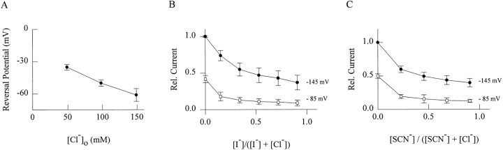 Figure 12. Concentration dependence of the reversal potential and mole fraction behavior in hClC-1. (A) Dependence of the reversal potential on extracellular Cl− concentration measured in HEK-293 cells. Current reversal potentials were measured under biionic conditions with I− as the only permeant intracellular and Cl− as the only permeant extracellular anion. Iodide and Cl− concentrations were changed proportionally. (B and C) Mole fraction behavior of hClC-1 instantaneous current amplitudes measured in Xenopus oocytes at −145 and −85 mV for mixtures of Cl− and I− (B), and Cl− and SCN− (C). Instantaneous current amplitudes were measured on three different cells For each oocyte, five different mole fractions were tested. The mole fraction was changed by replacing equimolar amounts of NaCl with either NaI or NaSCN. Relative current was calculated by normalizing instantaneous current amplitudes to the value obtained at −145 mV measured in ND-96 solution. |
