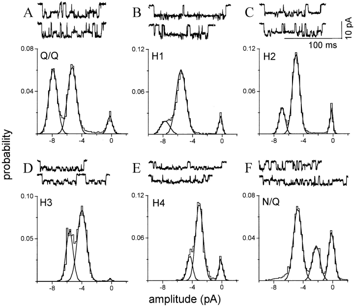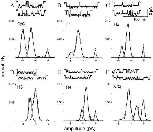 Figure 6. Six homogeneous cluster patterns are apparent upon expression of a mixture of NR1 plus mutant NR2 subunits. Each panel is from one patch in which one pattern predominated. The amplitude histograms pertain to all clusters in the patch; i.e., with no separation according to pattern. (A) The Q/Q pattern (see Fig. 1 B; n = 98 clusters). (B) Hybrid receptor pattern H1, with a main and sublevel similar to the Q/Q pattern but with a much higher relative occupancy in the sublevel (n = 44 clusters). (C) Hybrid receptor pattern H2, with a main level amplitude ∼15% lower than the Q/Q main level and with a preferential occupancy of the sublevel (n = 110 clusters). (D) Hybrid receptor pattern H3, with a main level amplitude ∼30% lower than the Q/Q main level, and nearly equal main and sublevel occupancies (n = 14 clusters). (E) Hybrid receptor pattern H4, with a main level of ∼40% lower than the Q/Q pattern, and a preferential occupancy of the sublevel (n = 13 clusters). (F) The N/Q pattern (see Fig. 1 C; n = 165 clusters). The amplitude, standard deviation, occupancy, and lifetime of the main and sublevel of each of these patterns is given in Table III. |