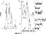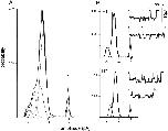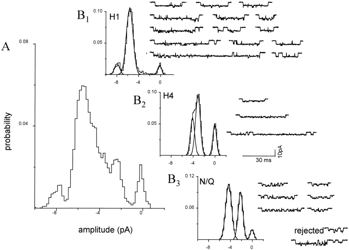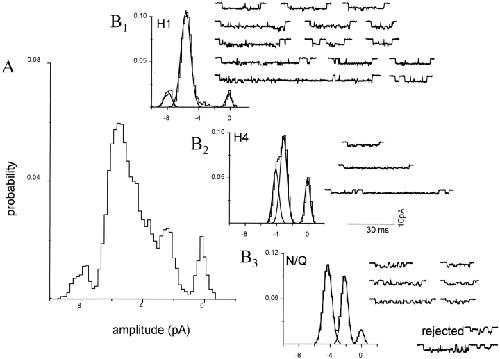 Figure 8. Separation of clusters by pattern: a mixed NR1 subunit patch with three patterns. The oocyte was injected with a 1:1 mixture of wild-type and mutant NR1 subunits plus pure mutant NR2 subunits. Clusters with the H1, H3, and H4 patterns were apparent, and were separated using a log likelihood criterion. All 25 clusters in this patch are shown. (A) Amplitude histogram of all clusters, before separation. Only the closed channel component (rightmost) is a distinct peak. (B) Amplitude histograms of clusters after separation by pattern. (B, 1) H1 clusters (n = 14). (B, 2) H4 clusters (n = 3). (B, 3) N/Q clusters (n = 6). (bottom right) Rejected clusters (n = 2) that had a low likelihood because of a multiple opening, or the chance juxtaposition of an H1 and an N/Q cluster. For examples of homogeneous H1, H4, and N/Q patterns see Fig. 6. |