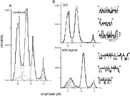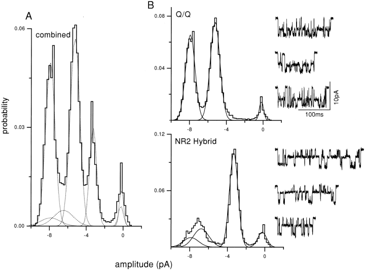 Figure 4. Separation of clusters by pattern: mixed NR2 subunit expression. The oocyte was injected with pure mutant NR1 subunits, plus a 1:1 mixture of wild-type and mutant NR2 subunits. Clusters with the Q/Q and NR2 hybrid patterns were apparent, and were separated using a log likelihood criterion. (A) All-points amplitude histogram of all 134 clusters in the patch, before separation. (B) Amplitude histograms of clusters, after separation. (top) Histogram and examples of separated Q/Q clusters (n = 100, main = −7.9 pA, sub = −5.2 pA); (bottom) histogram and examples of NR2 hybrid clusters (n = 25, open channel amplitudes of −7.9, −6.6, and −3.1 pA). 10 clusters (7.5%) were rejected because of a low log likelihood (not shown). When summed, the Gaussian components of the separated histograms (dotted lines in A) plus that of the rejected clusters equal the combined histogram. |