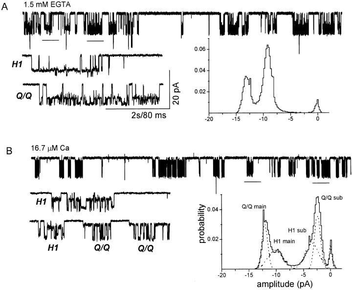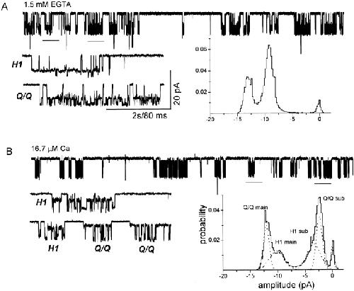 Figure 12. Q/Q and H1 receptors respond differently to extracellular Ca2+. Currents are from a single outside-out patch (Vm = −160 mV). The oocyte was injected with a 1:1 mixture of wild-type and mutant NR1, plus pure mutant NR2 subunits. Clusters with the Q/Q and H1 patterns were apparent. All traces are continuous. (A) Cluster patterns in Ca2+-free solutions. (bottom right) Amplitude histogram of all clusters. The main and sublevel peaks for the Q/Q and H1 patterns overlap in Ca2+-free solution. (B) Cluster patterns in 16.7 μM extracellular Ca2+. Because of channel block by Ca2+, the sublevel of the Q/Q pattern is reduced to −1.0 pA, but the sublevel of the H1 pattern is reduced only to −3.0 pA. (bottom right) Amplitude histogram of all clusters. Separate components for main and sublevels of Q/Q and H1 receptors are now resolved in the presence of Ca2+. Note that the H1 pattern appears to have three open channel amplitudes, similar to the NR2 hybrid pattern (Fig. 3). The differential effect of Ca++ on the Q/Q and H1 sublevel demonstrates that these patterns arise from distinct receptor populations. |