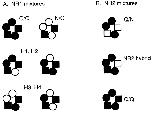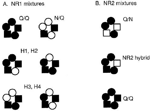 Figure 13. Summary of proposed pentameric NMDA receptor stoichiometry. The results are consistent with the presence of three NR1 subunits (circles) and two NR2 subunits (squares) per receptor (black indicates a mutant subunit). It is assumed that both the number and position of the mutant sidechains influence the current pattern, and that compositions that superimpose upon rotation or reflection across a diameter are equivalent with respect to current pattern. The assemblies are drawn with the NR2 subunits apart, although the experiments do not distinguish whether they are adjacent or apart. (A) With three NR1 subunits, six nonequivalent compositions are possible when oocytes are injected with mixed NR1 subunits and pure NR2 subunits. (top) The all-mutant NR1 composition has the Q/Q pattern (left), and the all-wild-type NR1 composition has the N/Q pattern (right). (middle) Receptors with one wild-type and two mutant NR1 subunits can assemble with the mutant sidechains adjacent (left) or apart (right). (bottom) Receptors with two wild-type and one mutant NR1 subunit can assemble with the wild-type sidechains adjacent (left) or apart (right). Based on the results shown in Table IV, H1 and H2 patterns may have two mutant NR1 subunits, and H3 and H4 patterns may have one wild-type NR1 subunit. Example currents from each assembly are shown in Fig. 6. (B) With two NR2 subunits, only three nonequivalent compositions are possible when oocytes are injected with pure NR1 and mixed NR2 subunits. These compositions are associated with the Q/N pattern (top), the NR2 hybrid pattern (middle), and the Q/Q pattern (bottom). Example currents from each assembly are shown in Fig. 3. |
