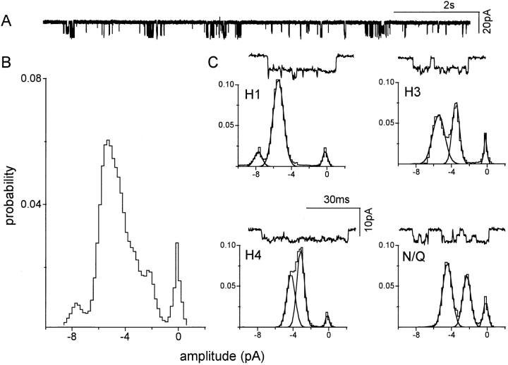 Figure 9. Separation of clusters by pattern: a mixed NR1 subunit patch with four patterns. The oocyte was injected with a 1:1 mixture of wild-type and mu-tant NR1 subunits, plus pure mutant NR2 subunits, and the outside-out patch was superfused with 20 μM NMDA plus pure 10-μM glycine in divalent-cation-free solution. Clusters with the H1, H3, H4, and N/Q patterns were apparent and were separated using a log likelihood criterion. (A) Continuous 10-s trace at low time resolution. (B) Amplitude histogram from all 444 clusters in the patch, before separation. Only the baseline, and a component at −7.8 pA, are distinct peaks. (C) Amplitude histograms of clusters after separation by pattern. (top left) H1 clusters (n = 154), (top right) H3 clusters (n = 48), (bottom left) H4 clusters (n = 34), (bottom right) N/Q clusters (n = 164). Rejected clusters (n = 44) are not shown. For examples of homogeneous H1, H3, H4, and N/Q patterns see Fig. 6. |