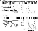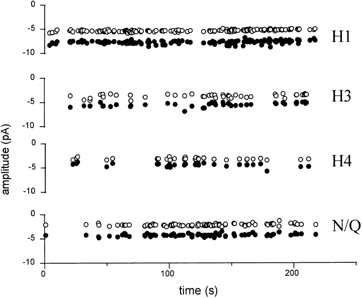 Figure 11. Pattern frequency and amplitudes are stable. Clusters of pattern H1, H3, H4, and N/Q were separated using a log likelihood criterion (same patch as in Fig. 9). The sub- (○) and main (•) level amplitudes are plotted for each cluster as a function of time. The results are consistent with four stable populations of receptor in the patch. Main and sublevel amplitudes of each pattern do not drift, and there is no apparent pattern switching or correlation among cluster frequencies of different patterns. |