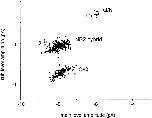 Figure 5. Cluster sub- versus main level amplitudes for mixed NR2 subunit expression. Oocytes were injected with a mixture of wild-type and mutant NR2, plus pure mutant NR1 subunit RNAs. All valid clusters from 10 patches are plotted, irrespective of their classification according to pattern. Three groups are apparent. The bottom group is Q/Q receptors (see Fig. 2). The central group is NR2 hybrid receptors, composed of both wild-type and mutant NR2 subunits. There are three open channel current levels in this pattern; here, the smallest amplitude is plotted as a function of the largest amplitude. The top group is Q/N receptors. The number of clusters in this group is relatively small because during the automated analysis of clusters the sublevel was often not detected. |