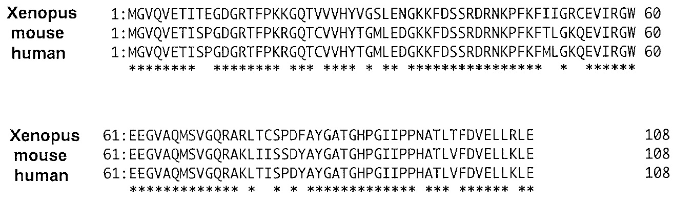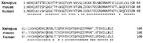FIG. 1. Amino acid sequences of Xenopus FKBP, mouse FKBP and human FKBP 12. Identical residues are marked with asterisks. The