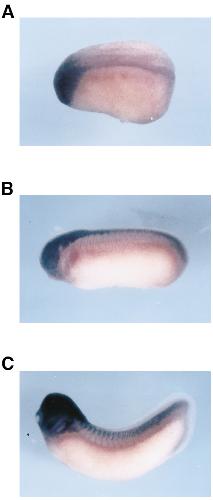 FIG. 3. Whole mount in situ hybridization analysis of FKBP mRNA in stage 18 (A) , 28 (B) and 31 (C) embryos.