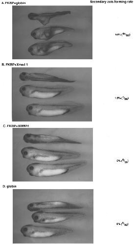 (C) Coinjection of FKBP mRNA ( 1 ng) with XBMP 4 mRNA ( 100 pg). The secondary axis formation was blocked in all embryos. (D)