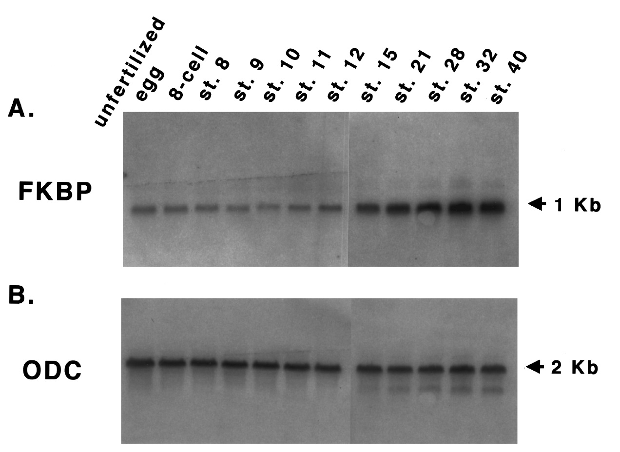 FIG. 2. Expression of FKBP mRNA in embryos. (A) Northern blot of FKBP. 20 mg of total RNA were used for each lane. (B) Expression
