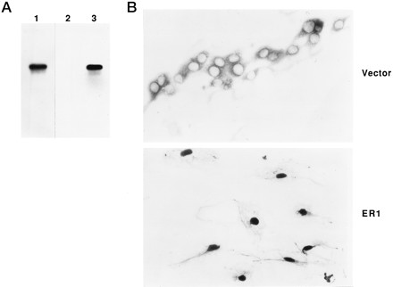We have utilized the polymerase chain reaction (PCR)-based differential display methodology (Liang, P., and Pardee, A. B. (1992) Science 257, 967-969) to identify a novel transcript whose expression levels increased in Xenopus embryo explants during mesoderm induction by fibroblast growth factor. The PCR product was used to clone a 2.3-kilobase pair cDNA representing this transcript, which we have named er1 (early response 1). The er1 cDNA contained a single open reading frame predicted to encode a protein of 493 amino acid residues. A data base homology search revealed that the predicted ER1 amino acid sequence contains three regions of similarity to the rat and human proteins encoded by the metastasis-associated gene, mta1, and two regions of similarity to the Caenorhabditis elegans sequence that is similar to mta1. The fibroblast growth factor-induced increase in er1 steady-state levels was not dependent on de novo protein synthesis, demonstrating that er1 is an immediate-early gene. Northern blot analysis revealed a single 2.8-kilobase pair mRNA that was observed predominantly during the initial cleavage and blastula stages of Xenopus development, with little or no detectable mRNA during subsequent development. Quantitative PCR analysis of early developmental stages showed that er1 peaked during late blastula. Computer-assisted analysis of the predicted ER1 amino acid sequence revealed two putative nuclear localization signals, four highly acidic regions clustered at the N terminus and a proline-rich region located near the C terminus. Subcellular localization by immunocytochemistry revealed that the ER1 protein was targeted exclusively to the nucleus. Transactivation assays using various regions of ER1 fused to the DNA binding domain of GAL4 demonstrated that the N-terminal acidic region is a potent transactivator. These data suggest that ER1 may function as a transcription factor.