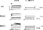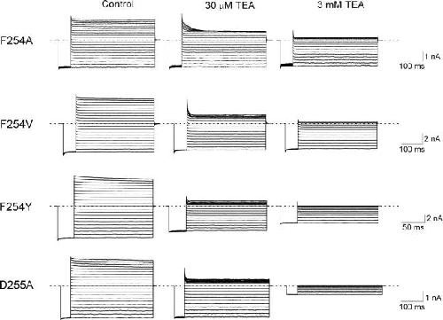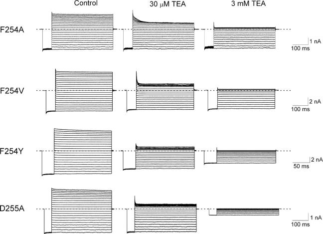 Figure 5. Inhibition by TEA of currents through channels with a mutation at F254 or D255. Current traces for each type of mutant channel were recorded from a single patch in the absence (control) or presence of TEA at the concentrations indicated. Dotted lines indicate the zero current level.