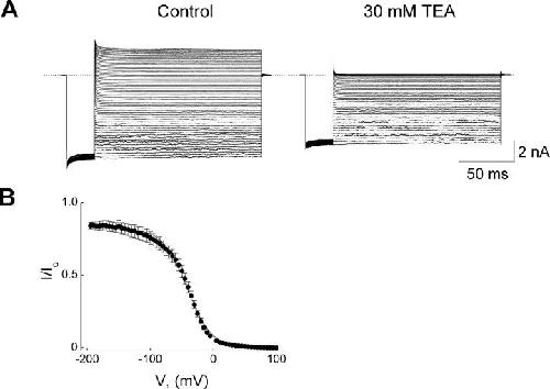 Figure 7. Inhibition of F254A mutant channels by a high concentration of TEA. (A) Current traces were recorded from a single patch in the absence (control) or presence of 30 mM TEA. Currents were elicited by stepping membrane voltage from the 0 mV holding potential to −200 mV and then to test voltages between −200 mV and +100 mV in 5-mV increments before returning it to the holding potential. Dotted line indicates the zero current level. (B) The (averaged) fraction of current not blocked by 30 mM TEA is plotted against membrane voltage between −200 and 100 mV. The curve though the data is a fit of a Boltzmann function (with an offset to account for the shallow state with much reduced spermine affinity), yielding appKd = 3.41 (±0.19) × 10−3 M and valence appZ = 1.34 ± 0.03 (mean ± SEM; n = 3).