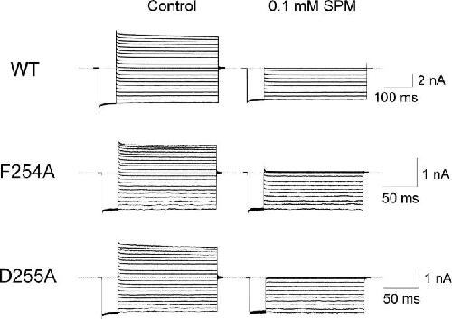 Figure 8. Inhibition by spermine of currents through channels with a mutation at F254 or D255. Current traces for wild-type and F254A and D255A mutant channels, each type recorded from a single patch in the absence (control) or presence of 0.1 mM spermine. During recordings, currents were elicited by stepping membrane voltage from the 0 mV holding potential to −100 mV and then to test voltages between −100 and +100 mV in 10-mV increments before returning it to the holding potential. Dotted lines indicate the zero current level.