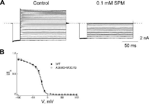 Figure 10. Inhibition of A306G-M307G double mutant channels by spermine. (A) Current traces recorded from a single patch in the absence (control) or presence of 0.1 mM spermine. (B) The (averaged) fraction of currents not blocked is plotted against membrane voltage for wild-type (taken from Fig. 9) and mutant channels. The curve through the mutant data is a fit of Eq. 1a, yielding K1 = 9.06 (±0.49) × 10−5 M and K2 = 1.45 (±0.16) × 10−2 with valences Z1 = 0.53 ± 0.02 and Z2 = 4.20 ± 0.16 (mean ± SEM; n = 5).