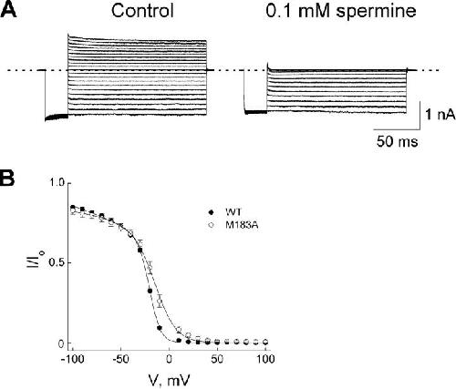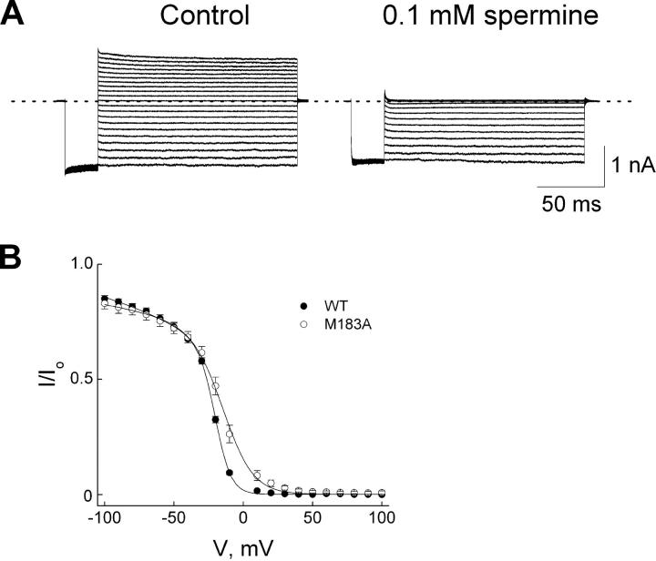 Figure 11. Inhibition of M183A mutant channels by spermine. (A) Current traces recorded from a single patch in the absence (control) or presence of 0.1 mM spermine. (B) The (averaged) fraction of currents not blocked is plotted against membrane voltage for wild-type (taken from Fig. 9) and mutant channels. The curve though the mutant data is a fit of Eq. 1a, yielding K1 = 2.11 (±0.39) × 10−4 M and K2 = 9.31 (±1.84) × 10−2 with valences Z1 = 0.21 ± 0.06 and Z2 = 2.20 ± 0.14 (mean ± SEM; n = 6).