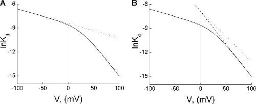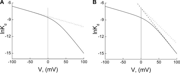 Figure 13. Predicted blocking properties of mutant channels lacking the shallow or the deep TEA-binding site. The identical solid curves represent a fit of Eq. 1a to the plot of lnappK versus Vm for wild-type channels, taken from Fig. 2 C. The dotted line in A is a simulation of the model with only the shallow site using the first term of Eq. 1a (K1 = 2.21 × 10−4 M and Z1 = 0.47), whereas the dotted line in B is a simulation of the model with only the deeper site using the second term of Eq. 1a (K1K2 = 1.02 × 10−3 M, Z1 = 0, and Z2 = 1.61). All values of the parameters used in the simulations were taken from Fig. 2 C, except Z1 in B, which was set as zero. The dashed line in B is the limiting slope of the steep phase.