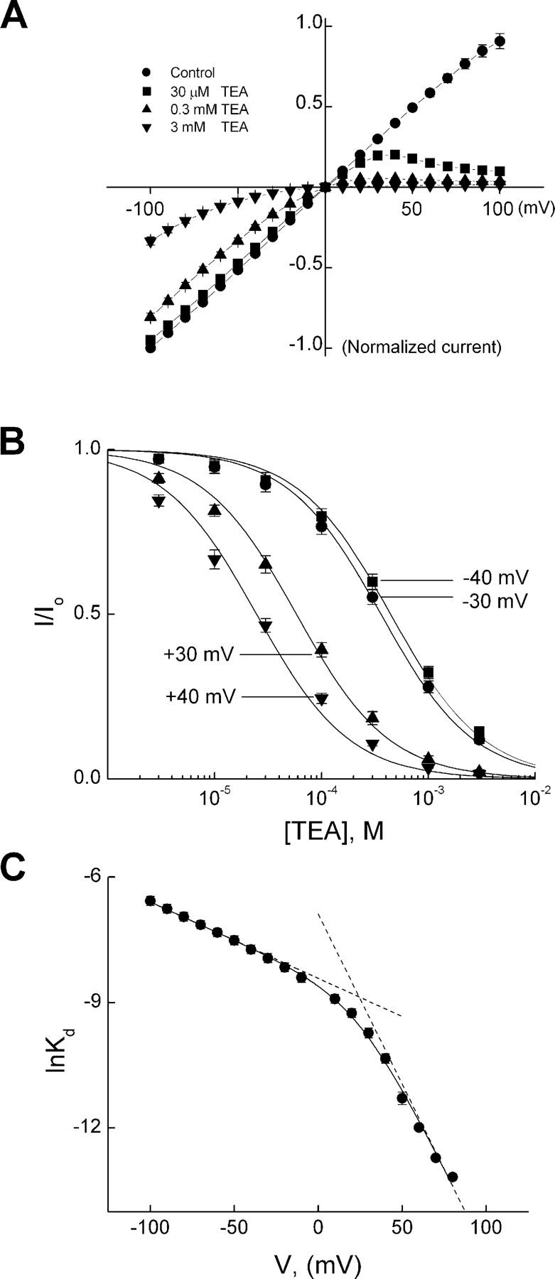 Figure 2. Voltage dependence of steady-state IRK1 block by TEA. (A) Averaged I-V curves (mean ± SEM; n = 6) determined at the end of test pulses in the absence (control) or presence of various concentrations of TEA. (B) The fraction of current not blocked is plotted against TEA concentration at the four representative voltages indicated. Curves through the data represent the equation I/Io = appKd/(appKd + [TEA]). (C) The natural logarithm of appKd is plotted against membrane voltage. The curve through the data is a fit of Eq. 1a, yielding K1 = 2.21 (±0.18) × 10−4 M and K2 = 4.65 ± 1.41 with valences Z1 = 0.47 ± 0.03 and Z2 = 1.61 ± 0.08 (mean ± SEM; n = 6). The dashed lines indicate the limiting slopes.