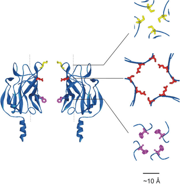 Figure 3. Crystal structure of cytoplasmic termini of GIRK1 (Nishida and MacKinnon, 2002). Shown on the left are two subunits of the cytoplasmic pore whose external end is on top. Side chains are highlighted for residues selenomethionine (Mse)308 (top, yellow), Ser225/Glu300 (middle, red), and Phe255 (bottom, pink), corresponding to Met307, Glu224/Glu299, and Phe254 in IRK1. Shown on the right are the center regions of cross sections through the tetrameric structure at the three levels indicated.