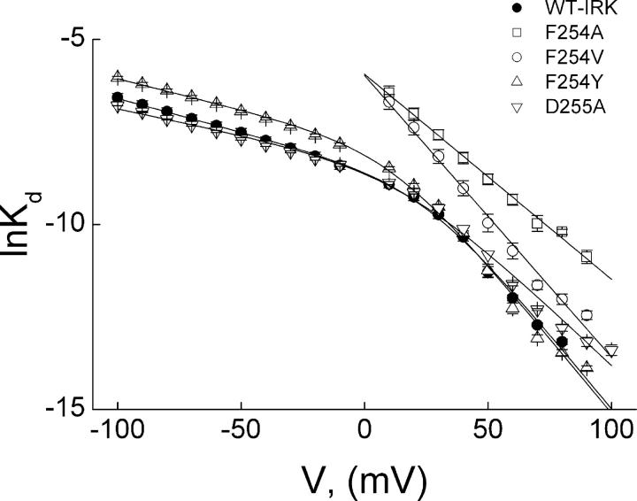 Figure 6. Voltage dependence of the apparent TEA affinity of channels with a mutation at F254 or D255. The natural logarithm of appKd for the mutant channels (determined as shown in Fig. 2 B) is plotted against membrane voltage. The data for wild-type channels (taken from Fig. 2 C) are plotted for comparison. The curves through the data for the F254Y and D255A mutant channels are fits of Eq. 1a, whereas lines through the data for F254A and F254V mutant channels are fits of a Boltzmann function (with parameters appKd and appZ). The fits yield K1 = 4.38 (±0.39) × 10−4 M and K2 = 2.05 ± 0.82 with valences Z1 = 0.43 ± 0.06 and Z2 = 1.64 ± 0.08 (n = 8) for F254Y; K1 = 2.55 (±0.25) × 10−4 M and K2 = 2.27 ± 1.07 with Z1 = 0.36 ± 0.07 and Z2 = 1.27 ± 0.08 (n = 3) for D255A; appKd = 2.64 (±0.20) × 10−3 M and valence appZ = 1.42 ± 0.03 (n = 5) for F254A; appKd = 2.54 (±0.41) × 10−3 M and appZ = 1.95 ± 0.07 (n = 6) for F254V.