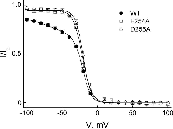 Figure 9. Voltage dependence of spermine inhibition of channels with and without a mutation at F254 or D255. The (averaged) fraction of current not blocked by 0.1 mM spermine is plotted against membrane voltage for wild-type and F254A and D255A mutant channels. The curve through the data for wild-type channels is a fit of Eq. 1; those for the mutant channels are fits of a Boltzmann function (with parameters appKd, appZ, and an offset of ∼5% to account for the shallow state with much reduced spermine affinity), yielding K1 = 1.30 (±0.06) × 10−4 M and K2 = 1.44 (±0.13) × 10−2 with valences Z1 = 0.40 ± 0.02 and Z2 = 4.23 ± 0.13 (mean ± SEM; n = 9) for wild type, appKd = 3.82 (±0.49) × 10−6 M and valence appZ = 3.96 ± 0.15 (n = 5) for F254A, and appKd = 2.45 (±0.28) × 10−6 M and appZ = 4.75 ± 0.14 (n = 8) for D255A.
