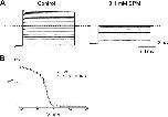 Figure 1. Inhibition of IRK1 currents by TEA. Current traces were recorded from a single patch in the absence (control) or presence of TEA at the concentrations indicated. Currents were elicited by stepping membrane voltage from the 0 mV holding potential to −100 mV and then to test voltages between −100 mV and +100 mV in 10-mV increments before returning it to the holding potential. Dotted line indicates the zero current level.