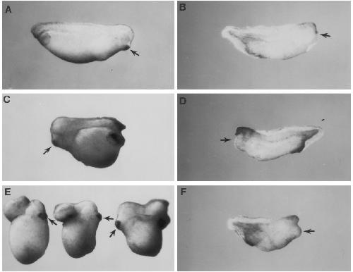 phenotypes. A, C, and E are embryos exhibiting various degrees of dorsalization produced by injection of dnxnf7 mRNA into the