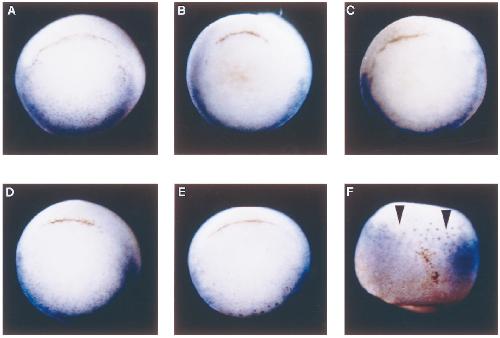 FIG. 8. dnxnf7 overexpression affects the expression of the mesodermal patterning gene Xvent-1. (A) In situ hybridization pattern of Xvent1 expression in uninjected stage 10 embryos. Embryos injected with wild-type xnf7-8 in the dorsal (B) and ventral (C) regions and analyzed for Xvent1 expression. Embryos injected with dnxnf7 in the dorsal (D) region and analyzed for Xvent1 expression. Embryo injected with dnxnf7 in the ventral (E) region and analyzed for Xvent1 expression. (F) Ventral view of the embryo shown in E to show gap in Xvent1 expression.