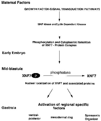 FIG. 9. Summary of the role of xnf7 in D/V patterning. xnf7 is phosphorylated during oocyte maturation by several different kinases at two sites. This results in its retention in the cytoplasm in a 670-kDa complex (Shou et al., 1996). It remains cytoplasmic until the MBT when it is dephosphorylated and enters the nucleus. We speculate that other components interact with xnf7 in nuclei within different regions of the embryo, resulting in the regulation of genes giving mesoderm a dorsal/ventral character. xnf7 probably functions in parallel with other mesodermal regulatory pathways.