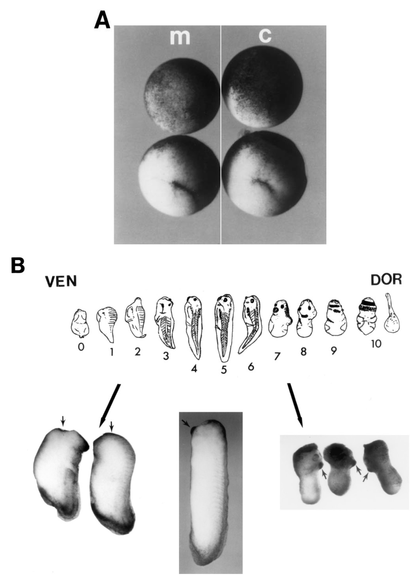 protein (GFP) mRNA in the ventral blastomeres. An example of a stage 35 dorsalized embryo is shown in A. B is a diagram of the embryo