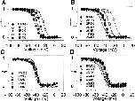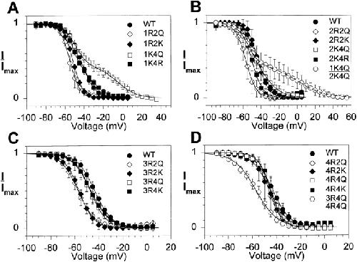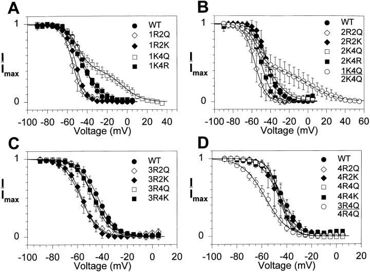 Figure 5. Effects of S4 mutations on steady state slow inactivation when fast inactivation is intact. Xenopus oocytes were injected with RNA encoding the wild-type sodium channel or each of the S4 mutants in the wild-type background, along with RNA encoding the β1 subunit. Currents were recorded as described in Fig. 3. The normalized peak current during the test pulse is plotted against the prepulse potential. Data are shown for the mutants in domains I (A), II (B), III (C), and IV (D). Data for the double mutants are shown in B and D. The data points represent the means of at least three determinations and the error bars show the standard deviations. The smooth lines are fits to a two-state Boltzmann function, as described in materials and methods. The parameters of the fits are included in Table III.