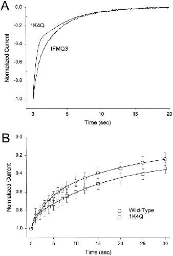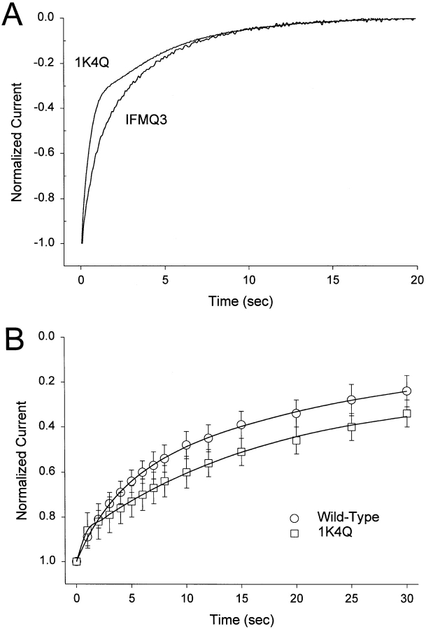 Figure 7. The 1K4Q mutation affects one component of slow inactivation. The kinetics of slow inactivation for the 1K4Q mutant channel were compared with those of the wild-type and IFMQ3 channels. (A) Oocytes injected with RNA encoding either the IFMQ3 channel or the 1K4Q mutant channel in the IFMQ3 (noninactivating) background were examined by two-electrode voltage clamping. The oocytes were held at −100 mV and depolarized to 0 mV for 60 s (only the first 20 s of the records are shown). The kinetics of inactivation for both channels were best fit with two exponential time constants. For the IFMQ3 channel, τ1 = 4.9 ± 0.9 s, A1 = 67 ± 9%, τ2 = 1.0 ± 0.2 s, A2 = 33 ± 9% (n = 5). For the 1K4Q channel, τ1 = 5.0 ± 0.5 s, A1 = 51 ± 8%, τ2 = 0.43 ± 0.06 s, A2 = 49 ± 8% (n = 3). (B) Oocytes injected with RNA encoding either the wild-type channel or the 1K4Q mutant channel in the inactivating background were examined by two-electrode voltage clamping. The protocol was similar to that shown in Fig. 3 except that the conditioning pulse was to a constant value of 0 mV and the duration of that pulse varied from 1 to 30 s. The amplitude of the current during the test pulse (normalized to the current obtained without any conditioning pulse) is plotted versus the conditioning pulse duration. The kinetics were best fit with two exponential time constants. For the wild-type channel, τ1 = 32.5 ± 15.3 s, A1 = 71 ± 12%, τ2 = 3.6 ± 0.9 s, A2 = 36 ± 9%, C = −0.07 ± 0.19 (n = 5). For the 1K4Q channel, τ1 = 14.2 ± 2.2 s, A1 = 62 ± 4%, τ2 = 0.2 ± 0.1 s, A2 = 14 ± 7%, C = 0.27 ± 0.05 (n = 4). Symbols represent means and error bars indicate standard deviations.