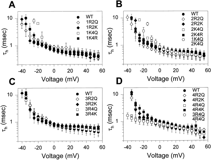 Figure 2. Effects of S4 mutations on the voltage dependence of fast inactivation time constants. Time constants (τh) of fast inactivation were determined for all of the mutants as described in materials and methods. The time constants are plotted on a log scale versus voltage for the mutants in domains I (A), II (B), III (C), and IV (D). Data for the double mutants are shown in B and D. The data points represent the means of at least three determinations and the error bars show the standard deviations.