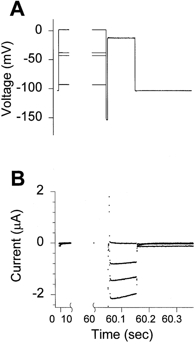 Figure 3. Voltage command protocol and representative current traces showing the voltage dependence of slow inactivation of the IFMQ3 channel. Xenopus oocytes were coinjected with in vitro transcribed RNA encoding the sodium channel α and β1 subunits. After 2 d incubation at 20°C, data were recorded using the two-electrode whole cell voltage clamp as described in materials and methods. Oocytes were held at −100 mV, and slow inactivation was induced by 60-s depolarizations from −90 to +5 mV in 5-mV steps. This was followed by a 20-ms hyperpolarization to −150 mV to allow recovery from fast inactivation (if any, since the channels all contain the IFMQ3 mutation) and a 100-ms test depolarization to −10 mV. (A) Representative traces of the command potential are shown for depolarizations to −90, −40, −35, and +5 mV. (B) The current recorded during the same series of depolarizations is shown. The largest inward current was obtained at a prepulse of −90 mV and essentially no current can be elicited after a +5-mV depolarization.