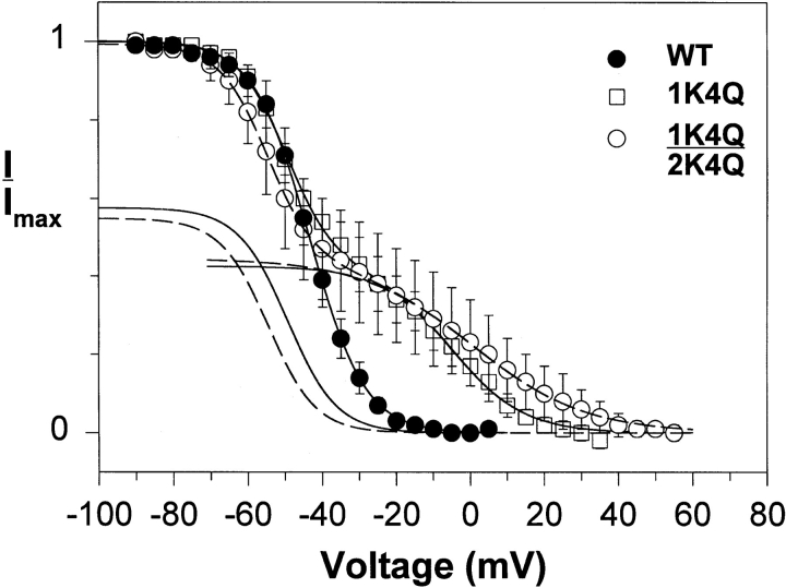 Figure 6. The 1K4Q mutation results in two components of slow inactivation when fast inactivation is intact. Steady-state slow inactivation of the wild-type sodium channel is compared with that of the 1K4Q and 1K4Q:2K4Q mutants. The smooth lines are fits to a single Boltzmann function for the wild-type channel, and the sum of two Boltzmann functions for the mutants. The parameters of the Boltzmann fits are shown in Table III.