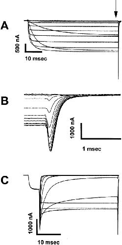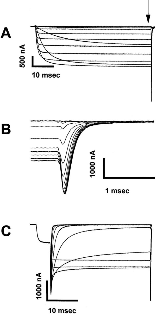 Figure 2. Representative current traces showing the activation and deactivation kinetics of the RBIIA channel containing the IFMQ3 mutation. Xenopus oocytes were co-injected with in vitro transcribed RNA encoding the sodium channel α and β1 subunits. After a 2-d incubation at 20°C, data were recorded using the cut-open oocyte voltage clamp method as described in materials and methods. (A) Current traces recorded during 57.5-ms depolarizations ranging from −50 to +50 mV. The IFMQ3 mutation removes fast inactivation, and all of the S4 mutations were made in this background. The tail currents occurring after repolarization are indicated by the vertical arrow in A and are shown in greater detail in B. (C) Instantaneous tail currents from the same oocyte were recorded after activation of the channels with a prepulse to +20 mV for 2 ms, followed by 75-ms steps to voltages ranging from −90 to 0 mV in 10-mV increments.