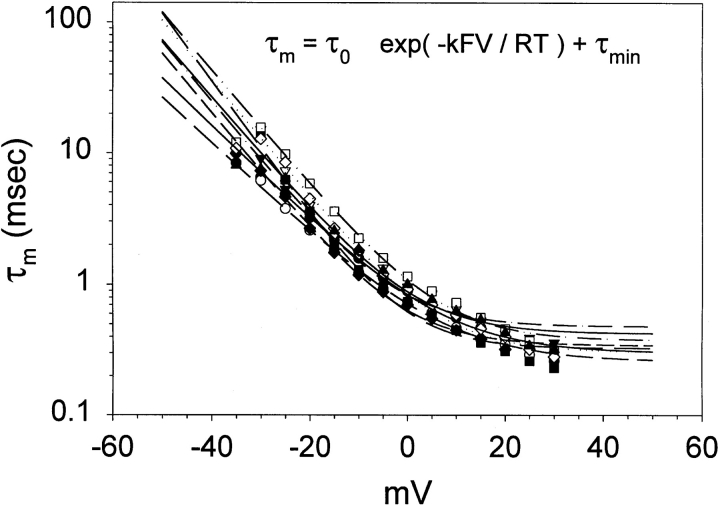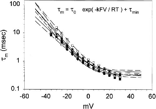 Figure 4. Determination of the voltage dependence of activation time constants in the IFMQ3 sodium channel. Sodium currents were recorded from oocytes expressing IFMQ3, as described in Fig. 3. The rising phase of the inward sodium currents was fit with a single exponential, as described in materials and methods. Each data point represents a single determination and the smooth lines were generated by a least-squares fit to an equation (inset) describing the voltage-dependent variation of the activation time constant (τm). The parameters of the fits are shown in Table II.