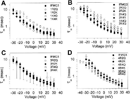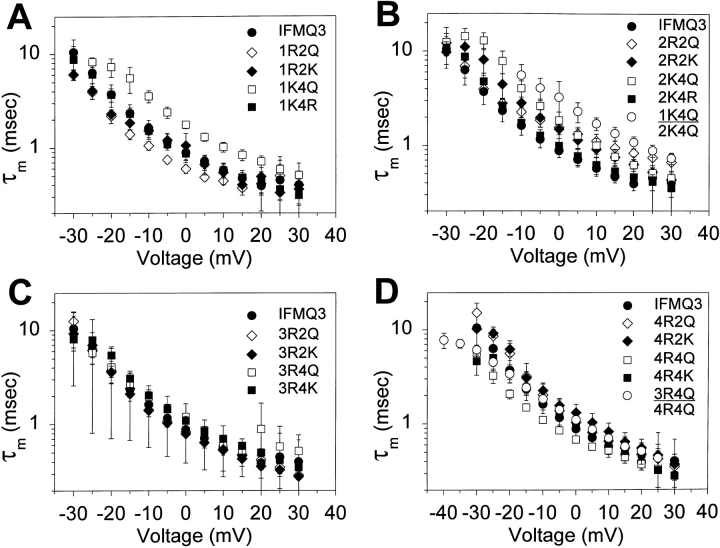 Figure 5. Effects of S4 mutations on the voltage dependence of activation time constants. Time constants of activation (τm) were determined for all of the mutants as described in Fig. 4. The values for potentials from −30 to +30 mV are shown for the mutants in domains I (A), II (B), III (C), and IV (D). Data for the double mutants are shown in B and D. The data points represent the means of at least three determinations and the error bars show the standard deviations. The parameters of the fits are shown in Table II.