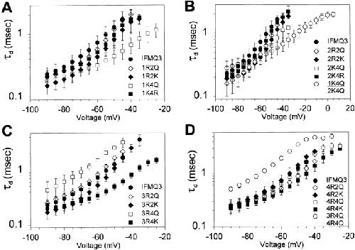 Figure 7. Effects of S4 mutations on the voltage dependence of deactivation time constants. Time constants of deactivation (τd) were determined for all of the mutants as described in Fig. 6. The values are shown for the mutants in domains I (A), II (B), III (C), and IV (D). Data for the double mutants are shown in B and D. The data points represent the means of at least three determinations and the error bars show the standard deviations. The parameters of the fits are shown in Table III.